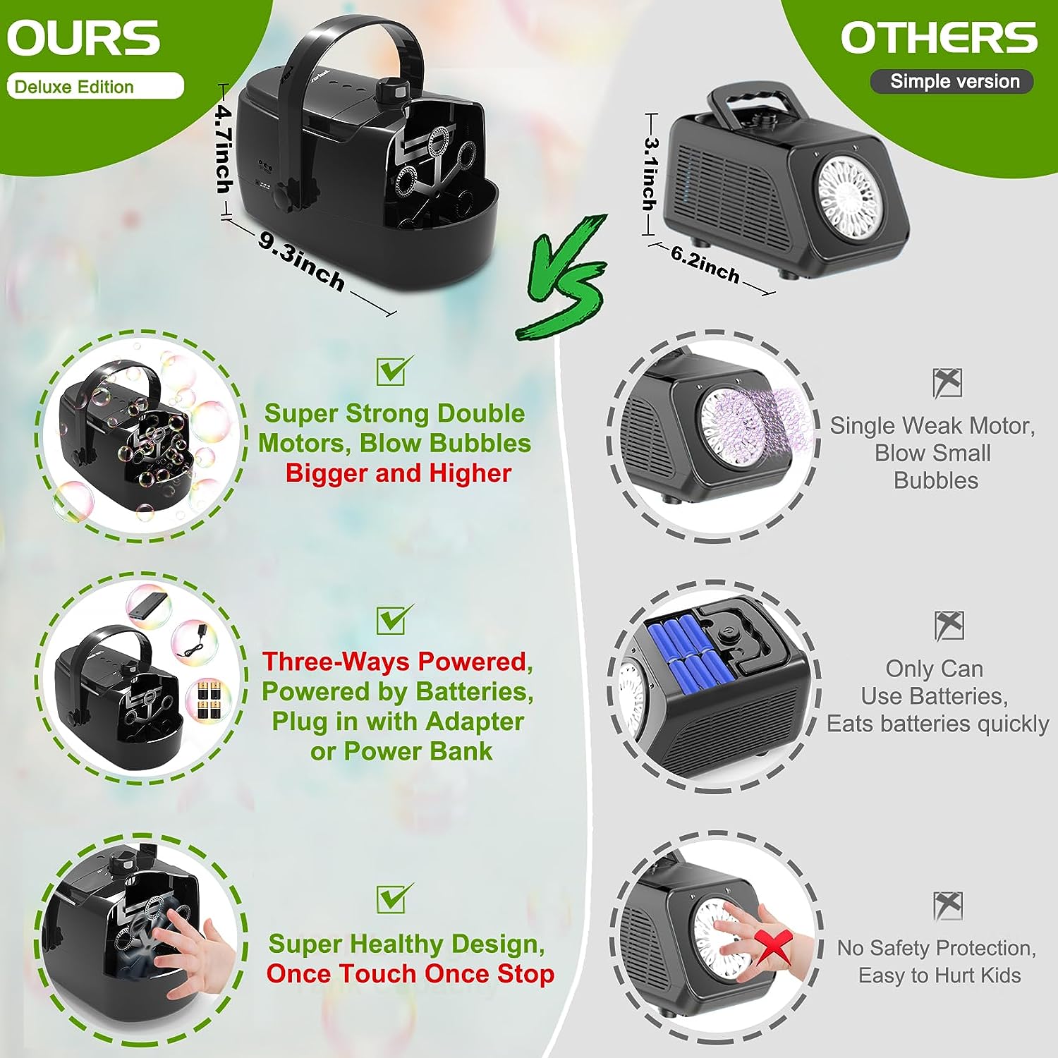 - 【Top Quality Materials & Safe Design】Made From Durable & High Quality ABS Material With Superior Toughness And Rust Protection, This Bubble Maker With Official CPC Toy Safety Certification Won’t Be Harmful To Kid, Toddlers ,Pets And Adults. Upgraded And Special Safe Design: Once Touch The Spinning Wands, And The Bubble Machine Will Once Stop Working.